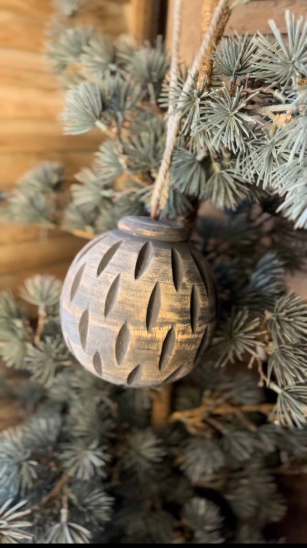 Een houten kerstbal met een omtrek tussen de 30-32cm. Leuk ter decoratie op een schaal of voor in de kerstboom.