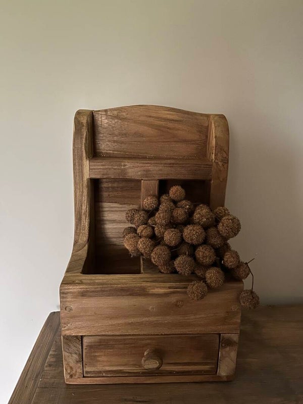 Een gruttersbak gemaakt van teakhout. Deze gruttersbak is 25cm breed 19,5cm diep en 40cm hoog.