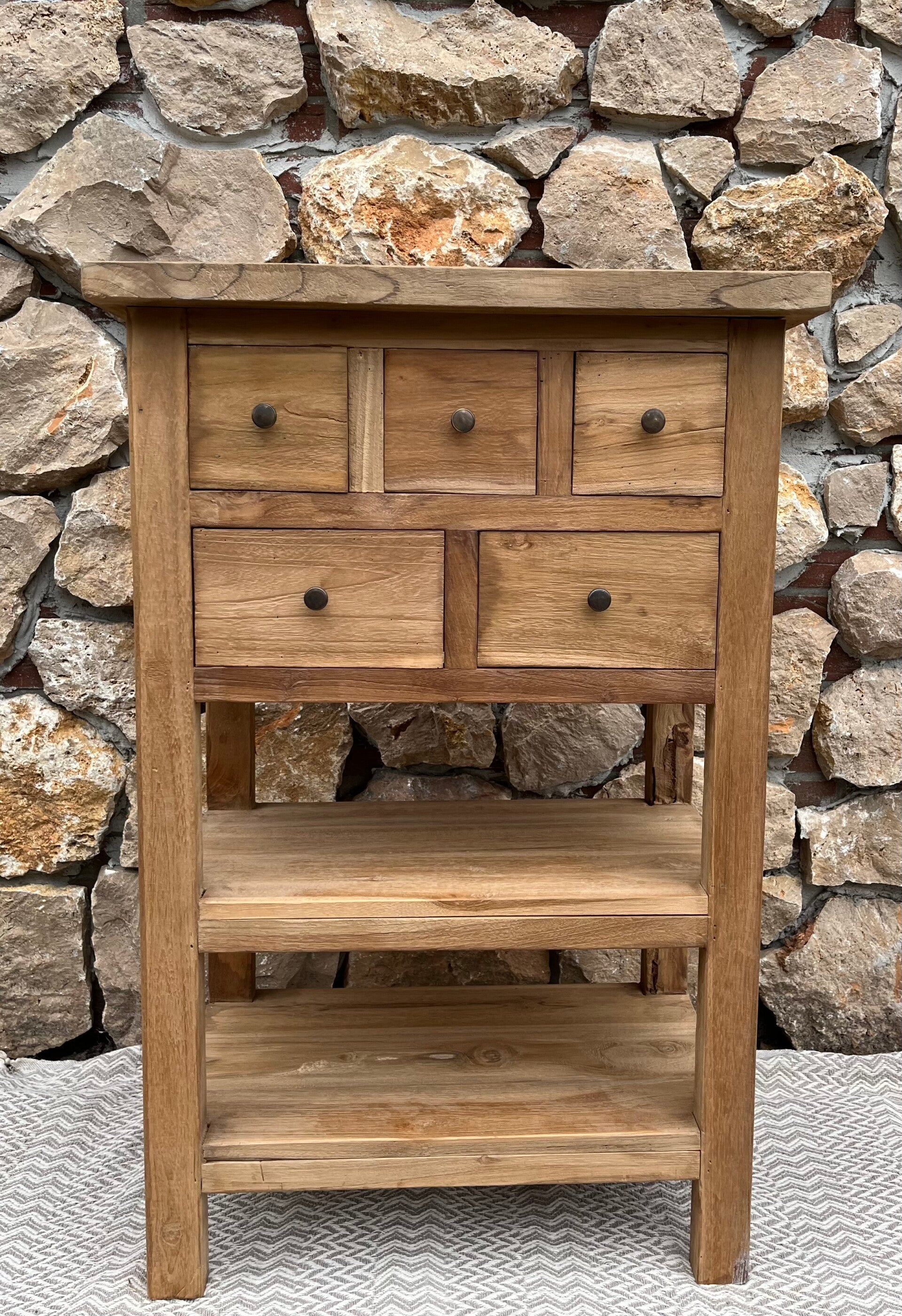 Een ladekast van teakhout. Deze ladekast is 60cm breed, 90cm hoog en 35cm diep.