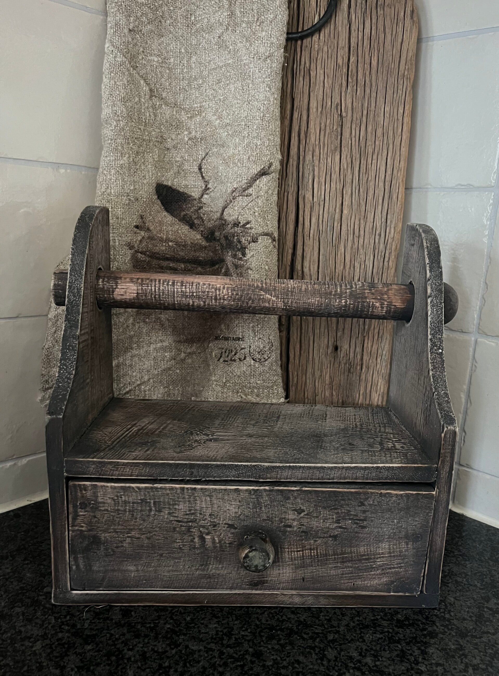 Een grutterbak in een grey washed kleur met keukenrolhouder.