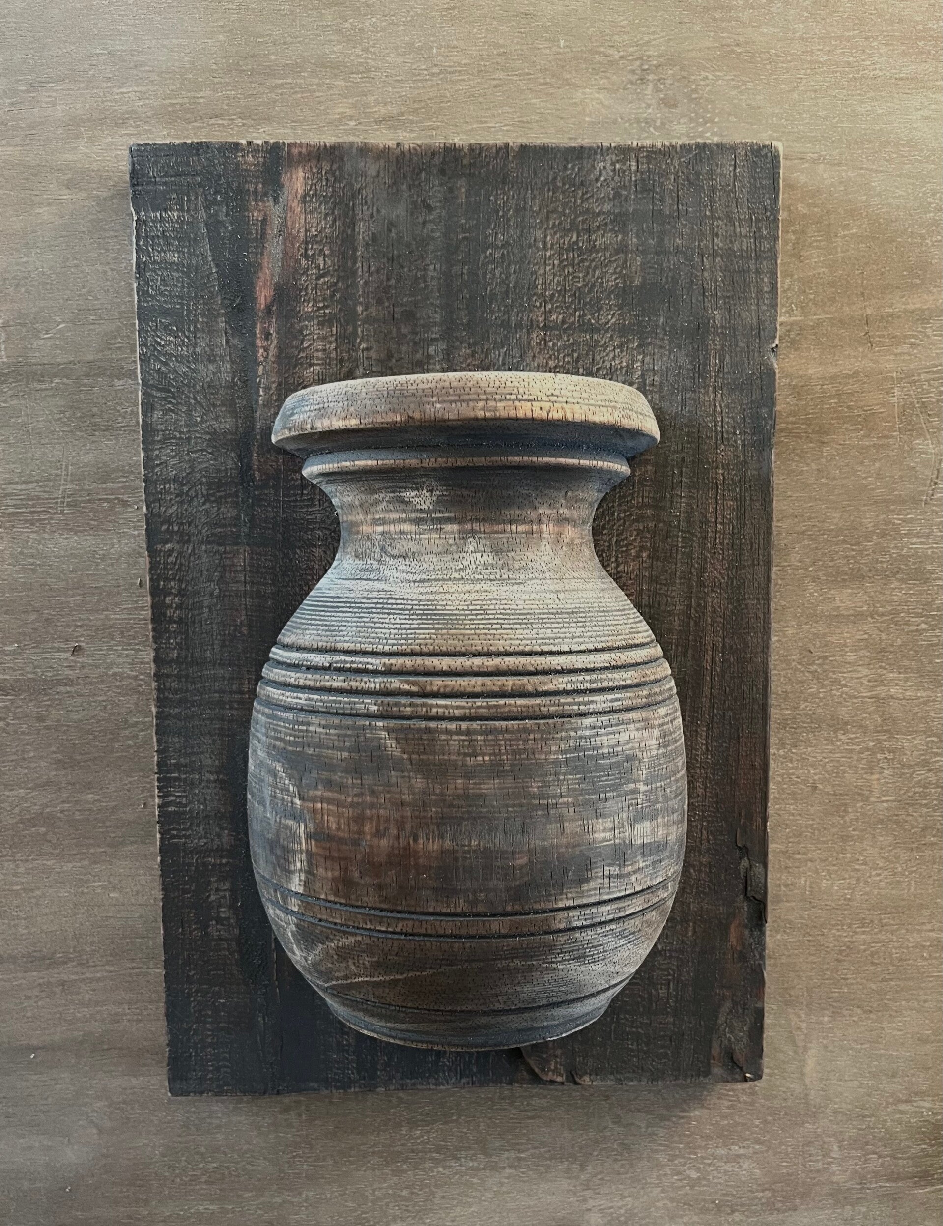 Een houten paneel met daarop een houten vaas. De vaas heeft een open bovenkant, perfect om er een stijlvol boeketje kunstbloemen in te plaatsen.